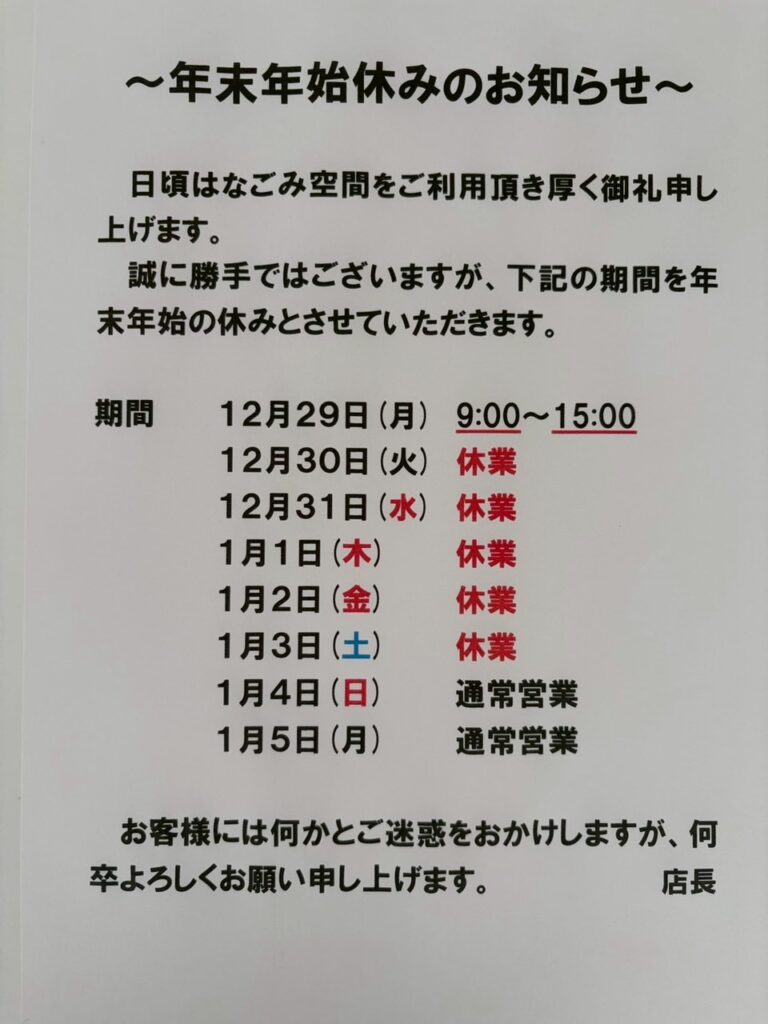 下記の通り12/29(月)9:00〜15:00までの営業とさせて頂き、年末年始は12/30〜1/3まで休業とさせて頂きます。